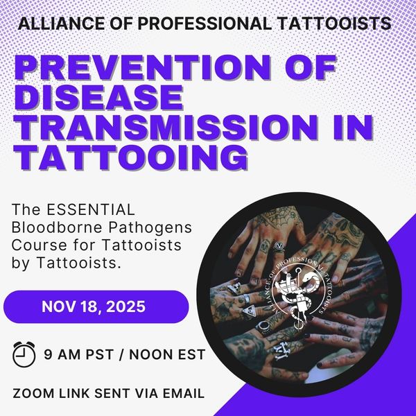 PDTT (Preventing Disease Transmission in Tattooing): A full-length, 5-hour course, covering bloodborne pathogens and more, taught live via Zoom, offered quarterly.